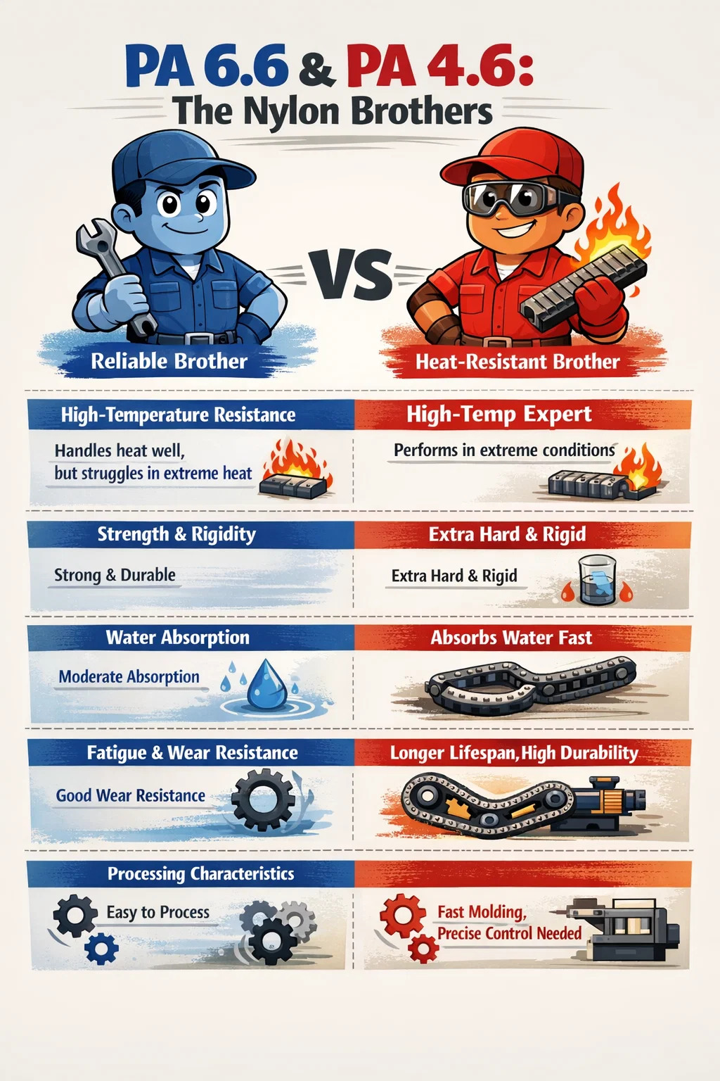 Dalam keluarga nilon, PA 6.6 dan PA 4.6 adalah seperti dua beradik, serupa dari segi rupa tetapi mempunyai personaliti dan keupayaan yang berbeza. Kedua-duanya tergolong dalam keluarga poliamida, tetapi mereka berprestasi agak berbeza apabila berhadapan dengan suhu tinggi dan aplikasi tekanan tinggi.