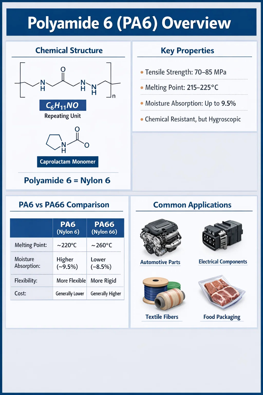 PA6 bermaksud Poliamida 6 , polimer termoplastik separa kristal yang dihasilkan oleh pempolimeran pembukaan cincin kaprolaktam. Ia tergolong dalam keluarga nilon yang lebih luas dan merupakan salah satu plastik kejuruteraan yang paling banyak digunakan di dunia. "6" merujuk kepada enam atom karbon dalam unit monomer berulang yang diperoleh daripada kaprolaktam (C₆H₁₁NO). PA6 juga biasanya dirujuk sebagai Nylon 6, dan kedua-dua istilah menggambarkan bahan asas yang sama.
