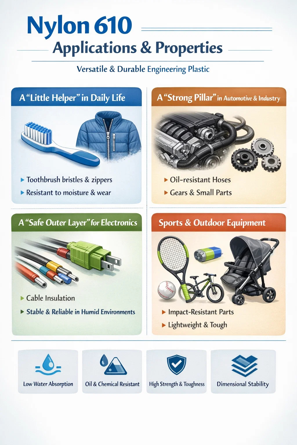 Berus dan gentian: Bulu berus gigi anda dan zip pada pakaian anda selalunya diperbuat daripada Nylon 610. Berbanding dengan biasa Nylon 6 , ia berfungsi lebih baik dalam persekitaran lembap, kurang terdedah kepada penyerapan air dan ubah bentuk, dan bulu mengekalkan keanjalannya walaupun selepas digunakan berpanjangan, menghalangnya daripada menjadi lembut dan lembik.