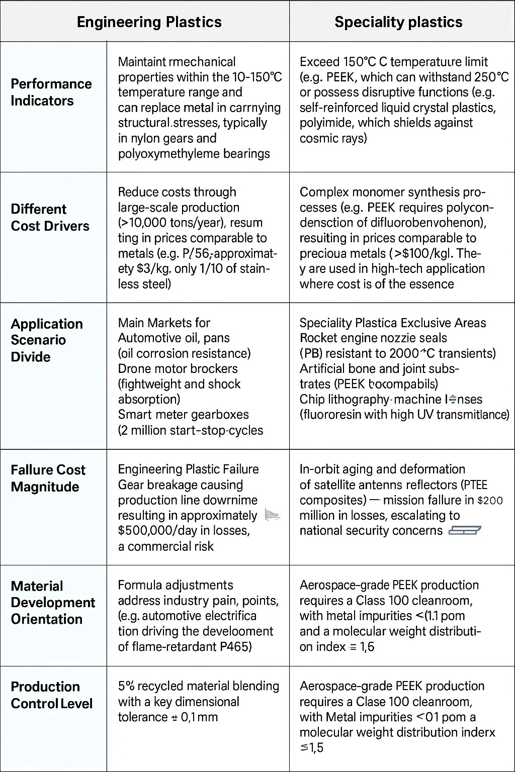 Perbezaan penting antara plastik kejuruteraan dan plastik khusus ialah: